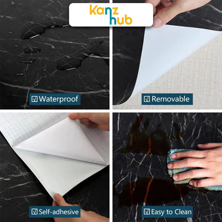 Peel-and-stick marble vinyl—sleek, waterproof, and easy to apply.