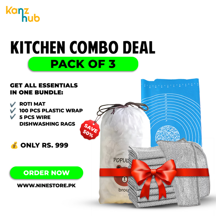 Kitchen Combo Deal Pack Of 3 | 1 Roti Mat, 100 PCS Plastic Wrap, 5 PCS Wire Rags